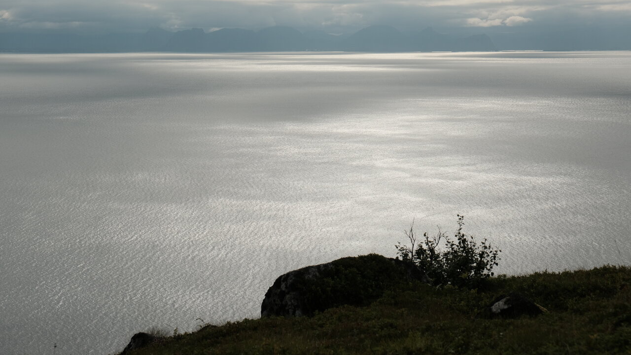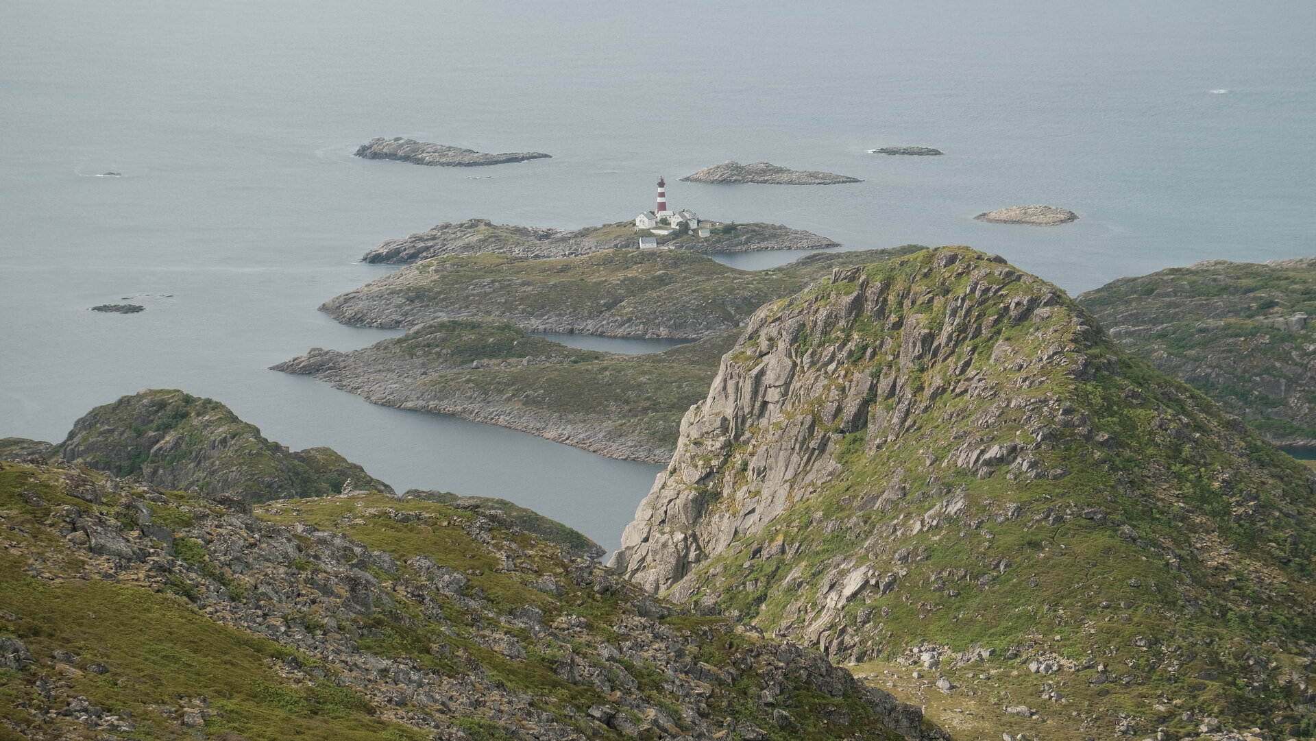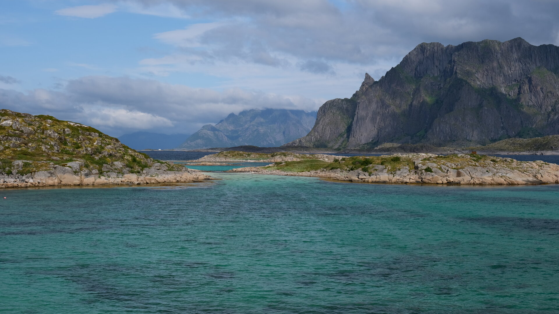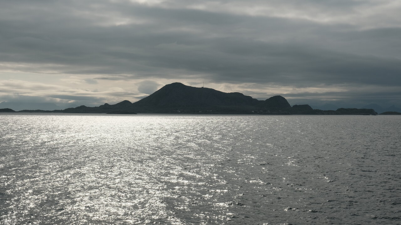 Die Insel Skrova bei der Anfahrt im Gegenlicht. Auf den „Hügel“ sollte es raufgehen …