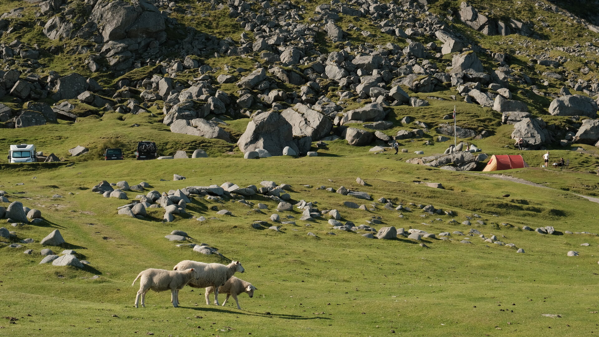 Das Wetter traumhaft, fast wolkenlos, und hinter jeder Kurve lauerte ein neuer Postkartenanblick! Eine erste Pause wurde für einen ca. 5 km langen Spaziergang (fast keine Höhenmeter!) rund um eine der vielen Erhebungen und entlang des Wassers genutzt. Die angebotene Alternative, AUF den Hügel zu steigen, wollte keiner mehr nutzen :-)
