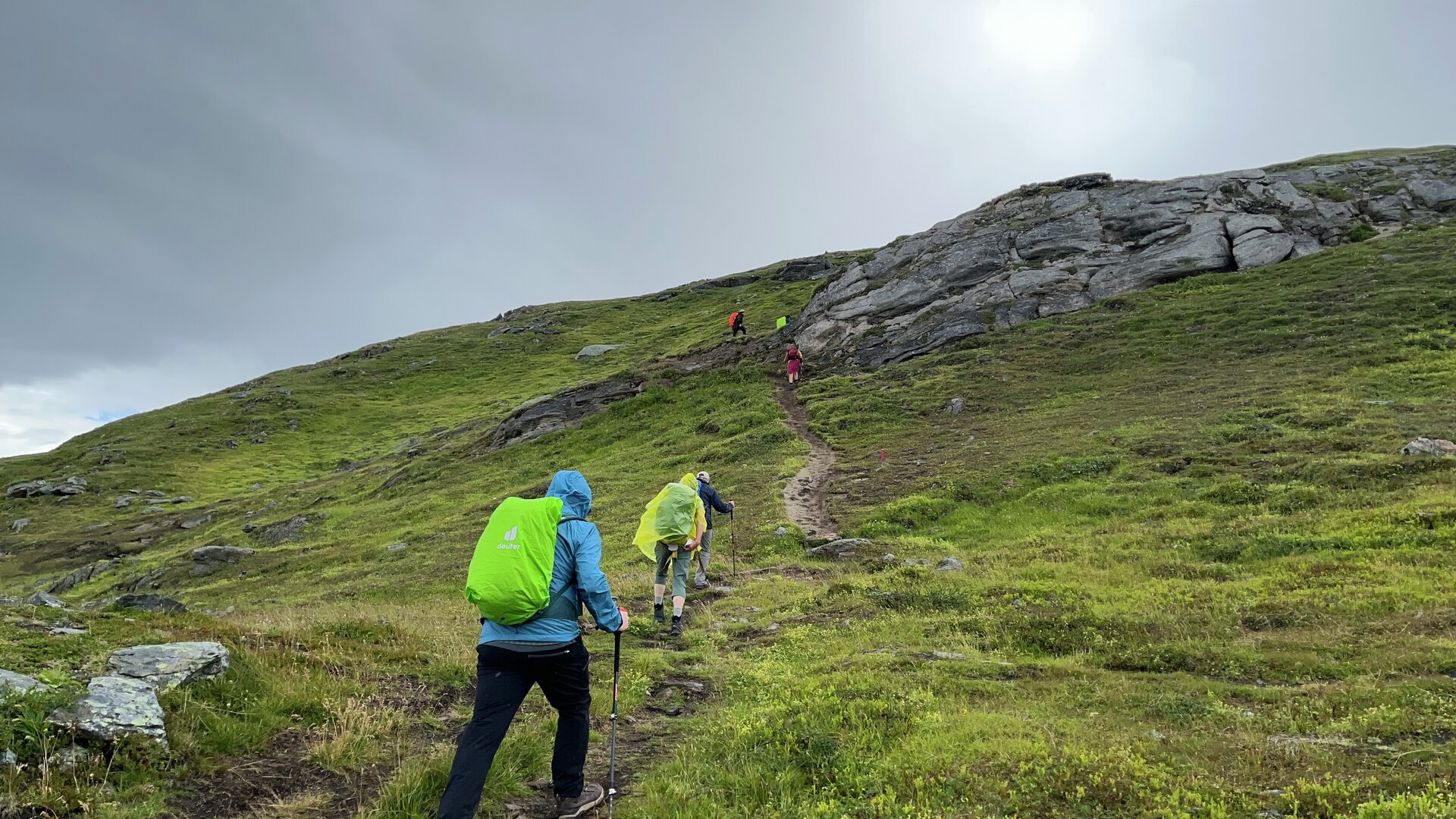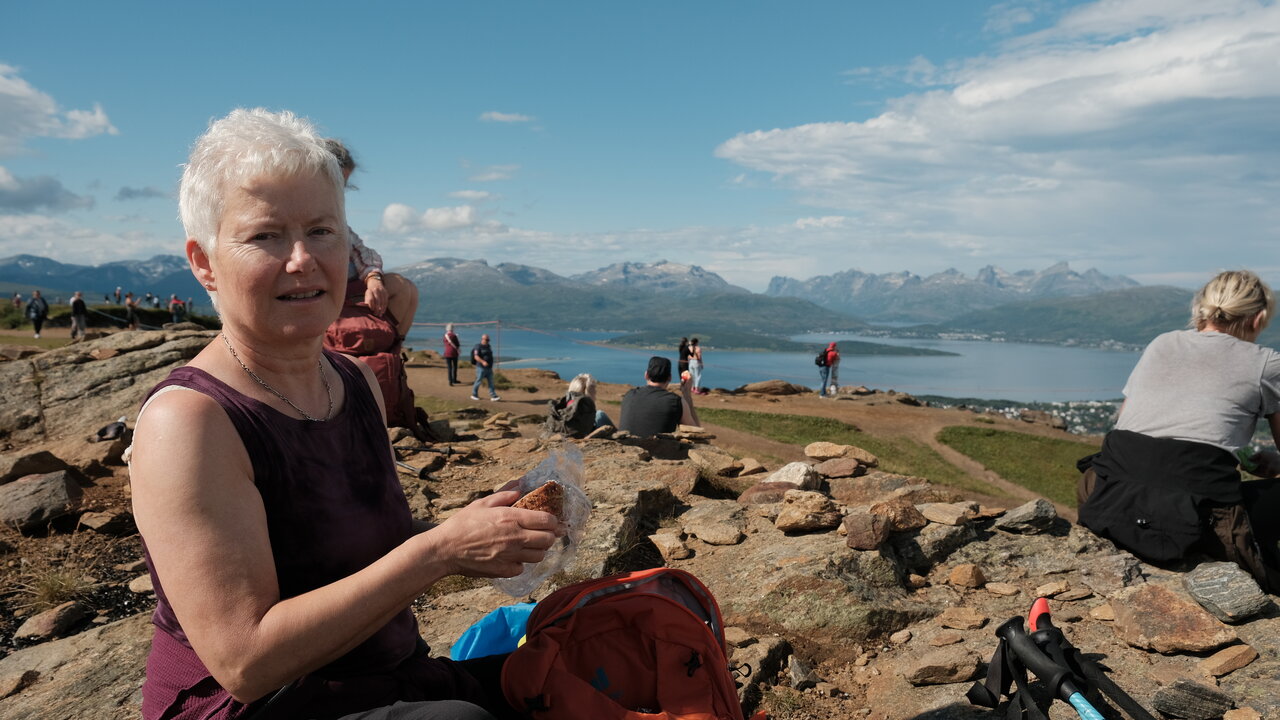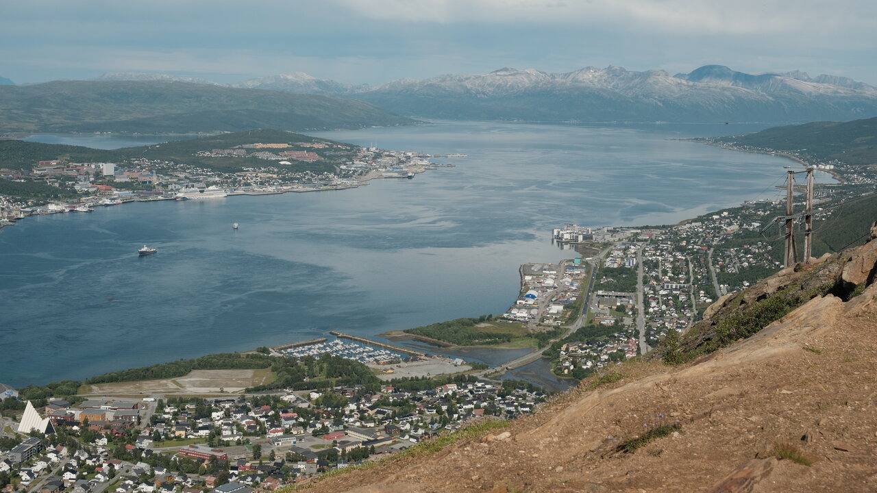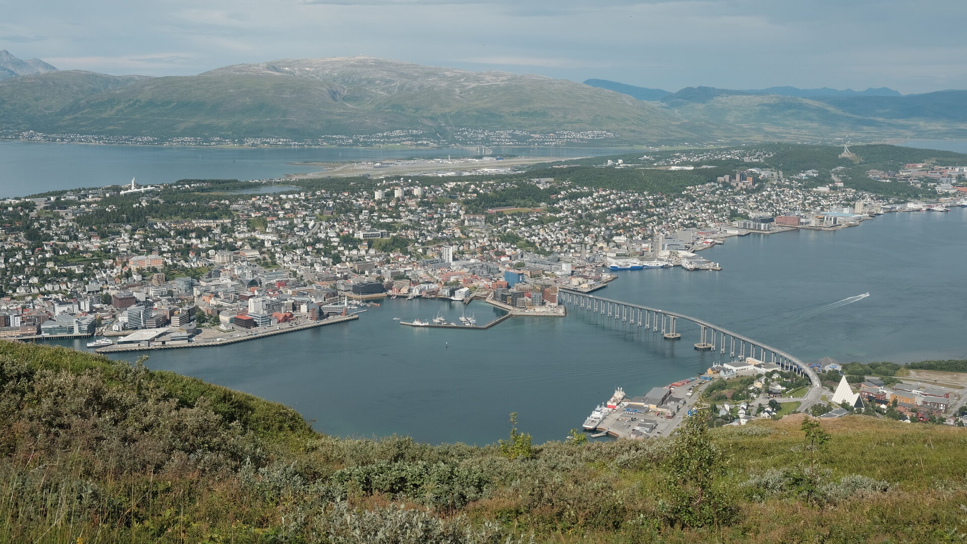 Heute ging’s zum Auftakt auf den Fløya, den „Hausberg“ von Tromsø. Auf dem Bild oben links ist die Bergstation einer Seilbahn zu sehen, die wir natürlich NICHT genommen haben (das überlassen wir gerne den gehfaulen Horden der Aida-Kreuzfahrt-Touris, die da oben hin einen Landausflug gemacht haben). Wir sind mit unserer Gruppe (übrigens 12 Personen inkl. unserer Reiseleiterin, 9 Frauen und 3 Männer) natürlich im Schweiße unseres Angesichts die gut 600 Höhenmeter bei sehr wechselnden Wetterbedingungen raufgekraxelt.