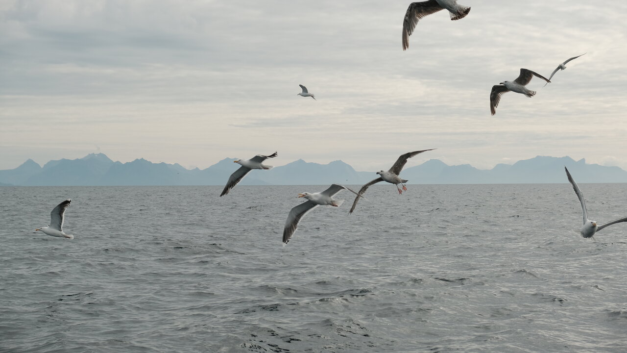 Die Möven geben einen Hinweis, wo sich möglicherweise Wale aufhalten könnten, denn die wiederum sind gerade auf Frühstückstour und suchen sich Heringsschwärme. Dadurch kommen die Heringe ziemlich nah an die Wasseroberfläche, was dann wiederum die Möven freut ….